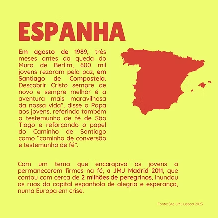 O maior encontro de jovens do mundo, a Jornada Mundial da Juventude , é o momento mais esperado pela juventude católica. Ele acontece a cada dois/três anos em países diferentes, geralmente seguindo uma ordem: países da Europa em um ano, países de outros continentes no ano seguinte. Podemos perceber esta lógica através das últimas edições. Em 2011, a Espanha foi palco da JMJ. Dois anos depois, em 2013, foi a vez do Brasil. Já em 2016, a Polônia acolheu a jornada, enquanto o Panamá, foi o último país a receber a JMJ, em 2019. Em 2027, é a vez de Seoul, na Coreia do Sul.